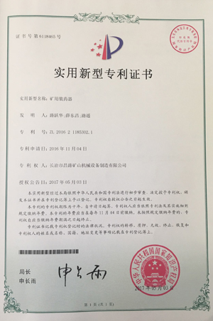 恭賀我公司產(chǎn)品礦用裝藥器于2017年5月3日再次獲得國(guó)家專(zhuān)利證書(shū) 專(zhuān)利證號(hào):ZL 2016 2 1185302.1
