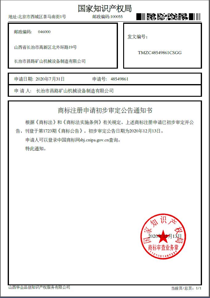 商標注冊申請初步審定公告通知書